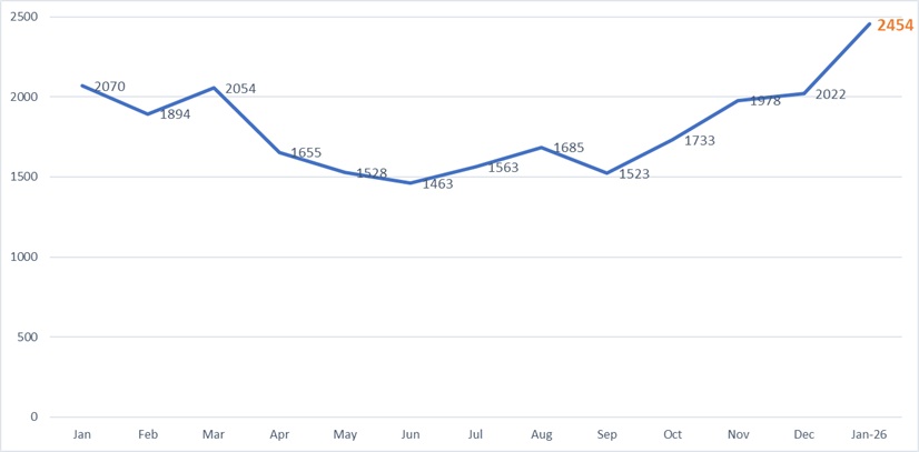 Figure 1. International visitors by month in 2025 and January 2026 (thousands of arrivals)