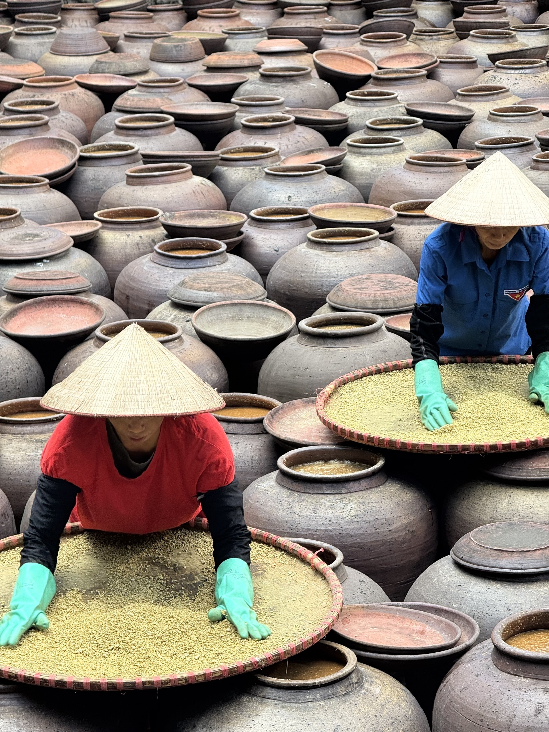 For the next two to three months, the jars are placed outdoors to ferment naturally under the Vietnamese sun. Locals occasionally stir the mixture to ensure even flavor development. Over time, the sauce darkens, thickens, and releases a rich, nutty aroma that fills the air — the unmistakable scent of Tương Bần.